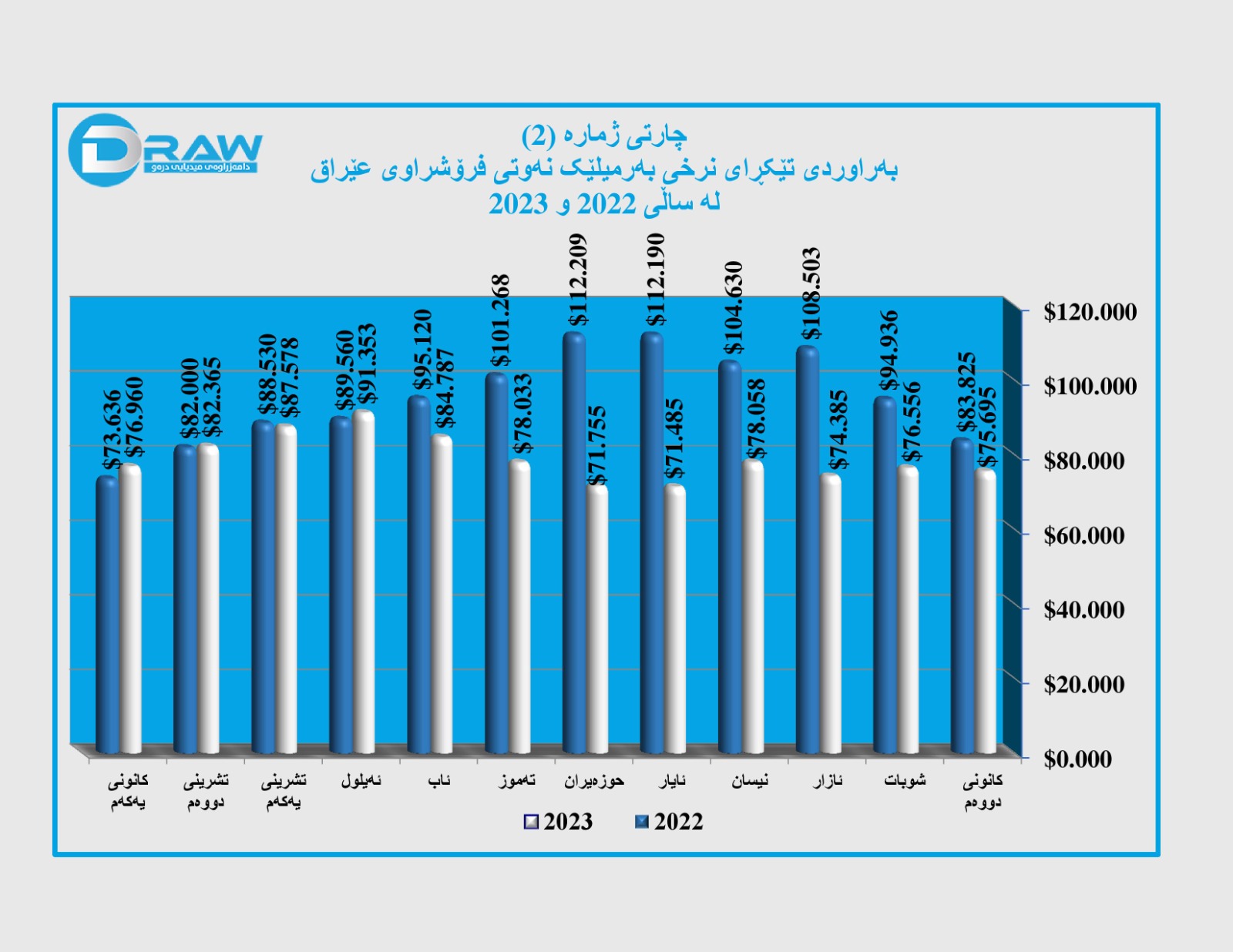 هەرچی دەربارەی تێکڕای نرخی نەوتی خاوی عێراقە، لە سەرەتاوە تا کۆتایی ساڵی (2023)، بە تێکڕا هەر بەرمیلێکی نەوتی عێراق بە (79) دۆلار فرۆشراوە. لە کاتێکدا لە ساڵی (2022) بە تێکڕا بەرمیلێک نەوت درابوو بە (95.5) دۆلار.