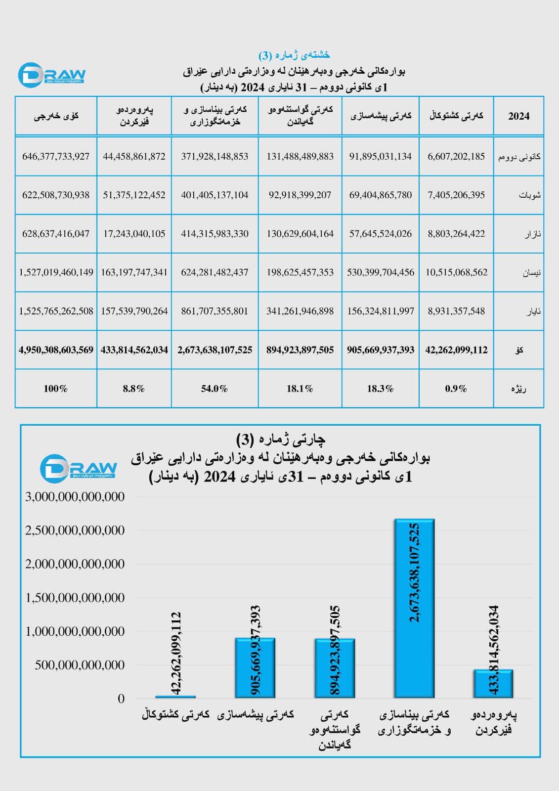 بۆ وردەکاری خەرجییەکانی وەبەرهێنان لە کەرتە جیاوازەکان لە پێنج مانگی یەکەمی ساڵی (2024) بڕوانە (خشتەو چارتی ژمارە (3)).