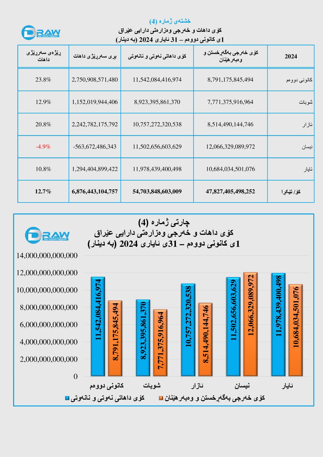 رۆژی (11ی تەموزی 2024) وەزارەتی دارایی عێراق داهات و خەرجی خۆی تا کۆتایی ئایاری ئەمساڵ بڵاوکردەوە، بەپێی ڕاپۆرتەکە؛