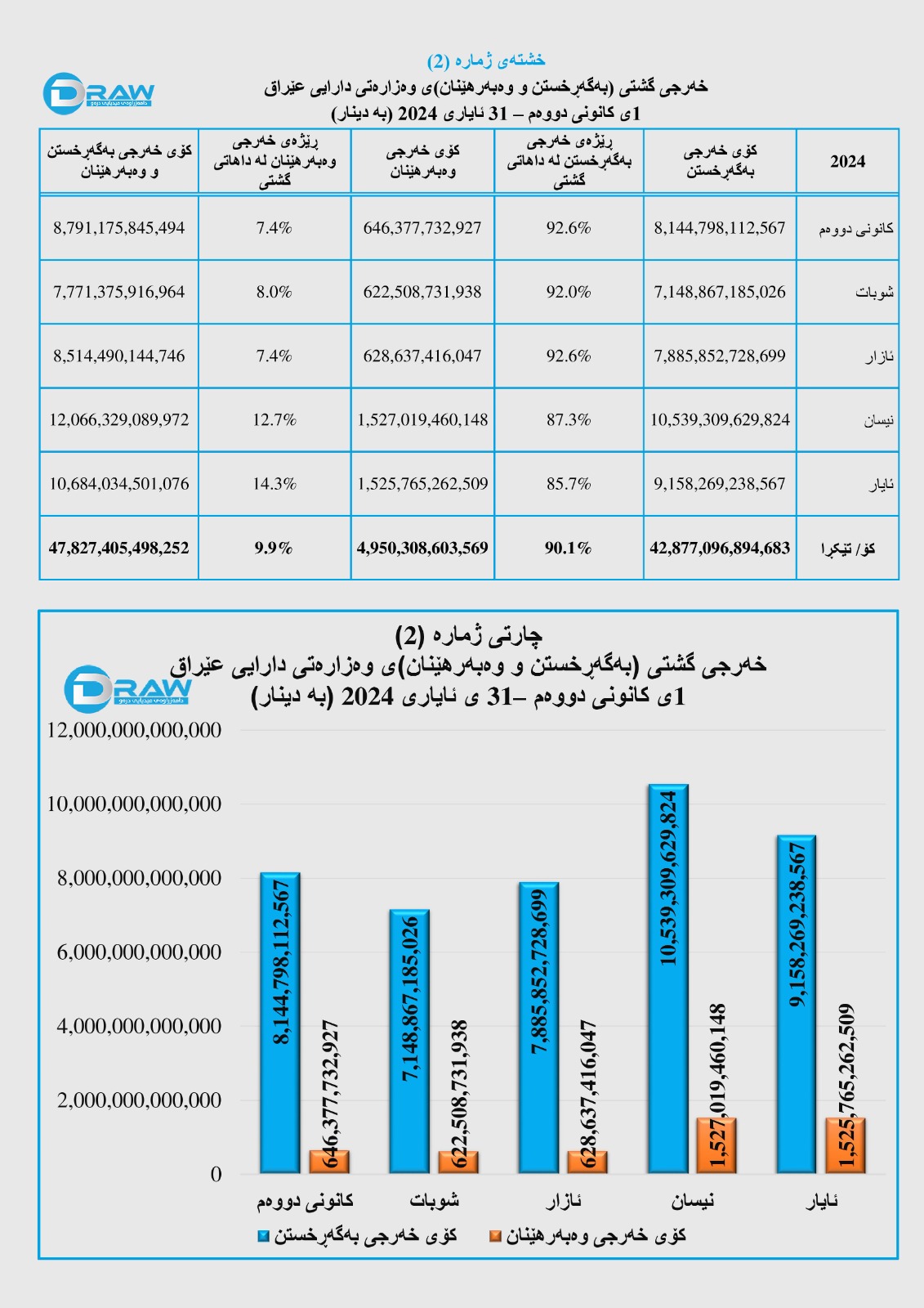رۆژی (11ی تەموزی 2024) وەزارەتی دارایی عێراق داهات و خەرجی خۆی بۆ پێنج مانگی یەکەمی ئەمساڵ بڵاوکردەوە، بەپێی ڕاپۆرتەکە؛
