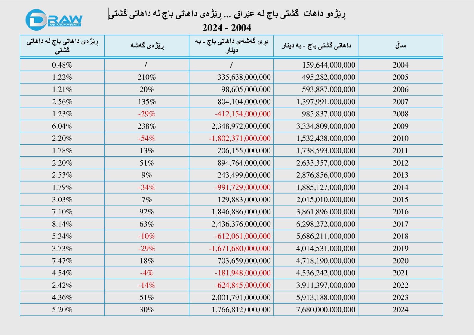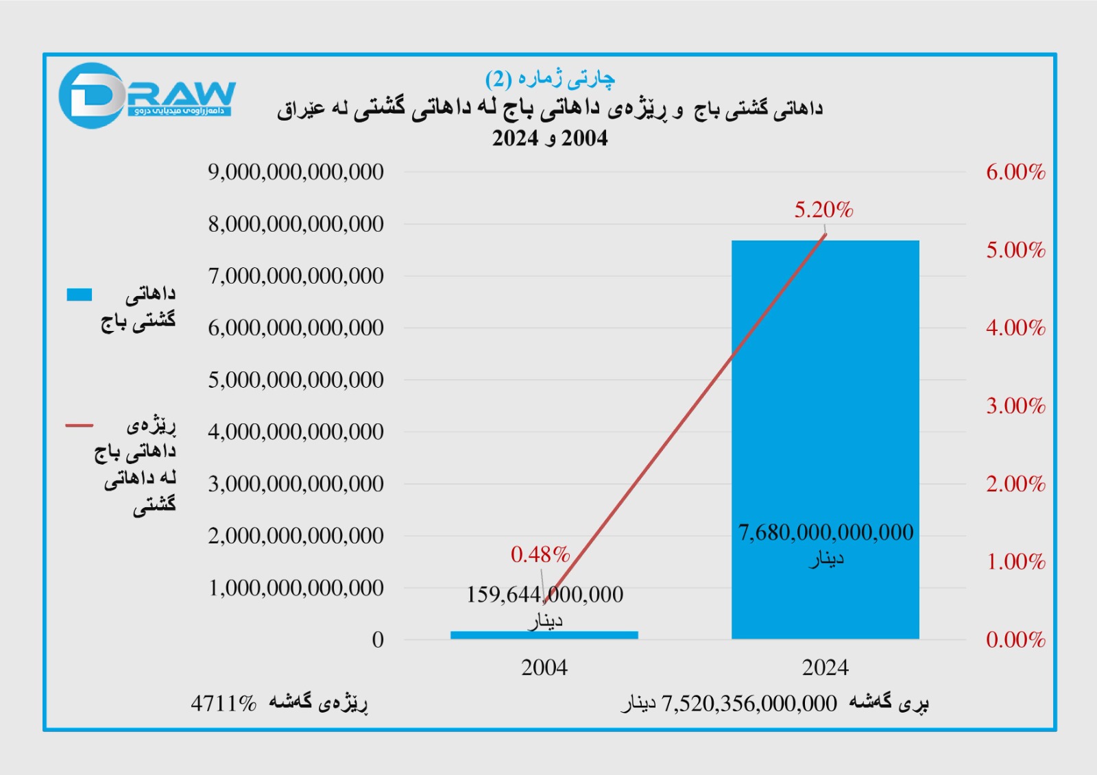 ? ئەو بڕەی لە ساڵی (2004) تۆمار کراوە نزیکەی ڕێژەی (0.5)ی داهاتی گشتی پێکهێنابوو، بەڵام داهاتی باج لە ساڵی (2024) ڕێژەی (5.2%)ی داهاتی گشتی پێکهێناوە.