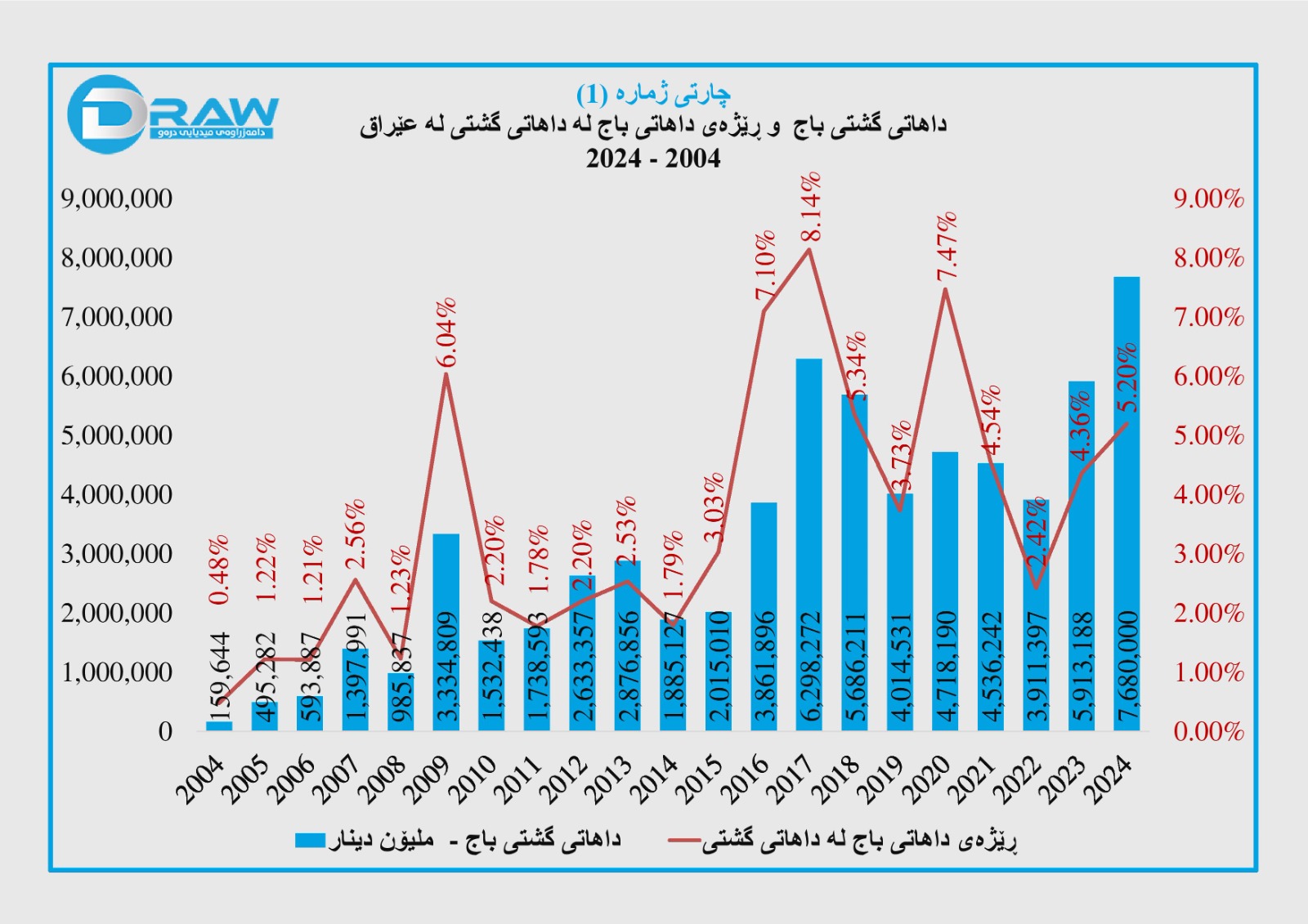 بەڵام ئەو بڕەی لە ساڵی (2004) تۆمار کراوە نزیکەی ڕێژەی (0.5)ی داهاتی گشتی پێکهێنابوو، بەڵام داهاتی باج لە ساڵی (2024) ڕێژەی (5.2%)ی داهاتی گشتی پێکهێناوە، لەم بارەیەوە (بڕوانە چارتی ژمارە (2)).