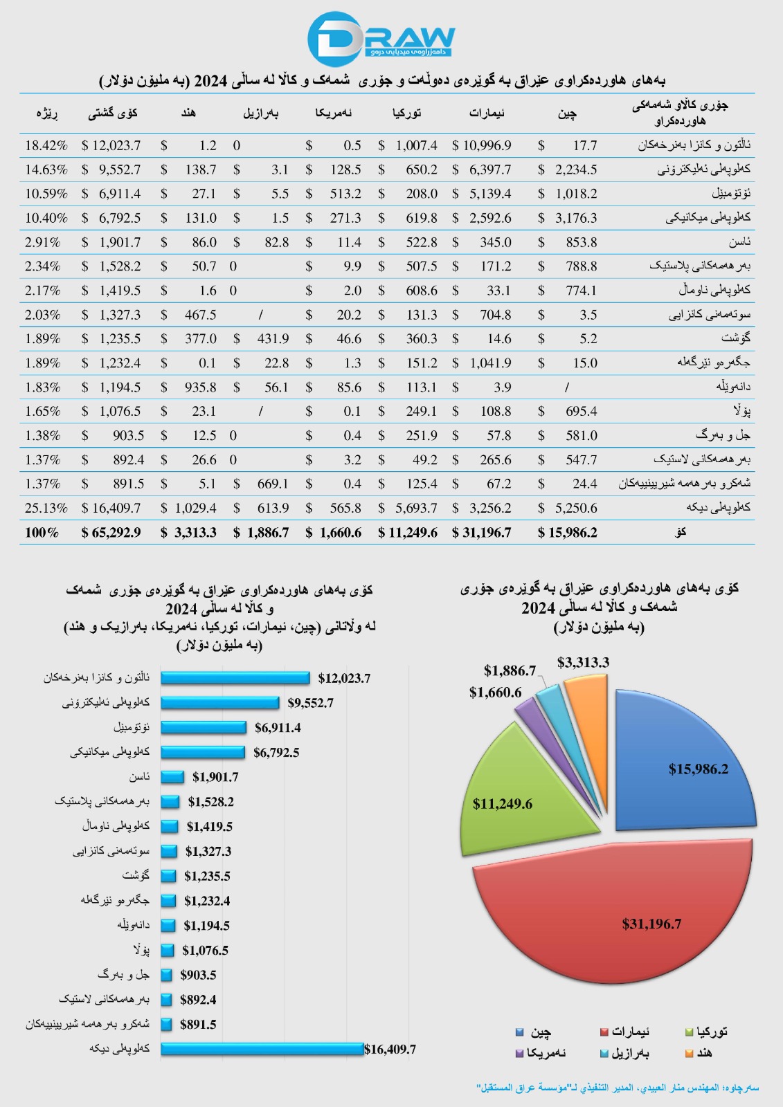 ? عێراق بە بەهای نزیکەی (65 ملیار و 293 ملیۆن) دۆلار کاڵاو شمەکی لە وڵاتانی (ئیمارات، چین، تورکیا، هند، بەرازیل و ئەمریکا)ەوە هاوردە کردووە.