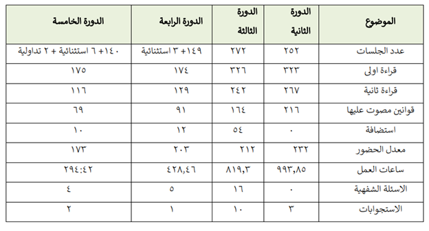 بەگوێرەی راپۆرتەكەی دامەزراوەی (مدارك)، بەراورد بە خولەكانی پێشوو، خولی پێنجەم پەرلەمانی عێراق لە چەند بوارێكدا پاشەكشێی بەخۆوە بینیوە، لەوانە ژمارەی دانیشتنەكان، دەرچواندنی یاساكان، میوانداریكردنی وەزیرو بەرپرسان، ئامادەگیی پەرلەمانتاران لە دانیشتنەكان و كاتژمێرەكانی كاركردن وەكو ئەوەی لە خشتەی خوارەوەدا دەردەكەوێت: