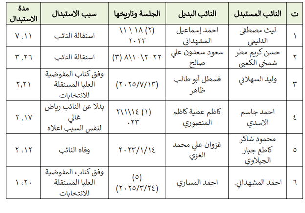 خولی پێنجەم، بەهۆی دەستلەكاركێشانەوە یاخود وەرگرتنی پۆست لە دەسەڵاتی جێبەجێكردن، ژمارەیەك جێگۆڕكێی پەرلەمانتاری بەخۆوە بینیوە، ئەمە لەدوای دەستلەكاركێشانەوەی (73) پەرلەمانتارەكەی سەدرەوە روویداوە، وەكو ئەوەی لە خشتەی خوارەوەدا دەردەكەوێت: