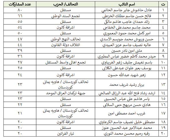 بەگوێرەی ئەو پێوەرانەی كە لەسەرەتای ئەم راپۆرتەكە ئاماژەی بۆ كردووە، دامەزراوەی (مدارك) بەمشێوەیە ناوی پەرلەمانتارە چالاكەكانی دیاریكردووە: