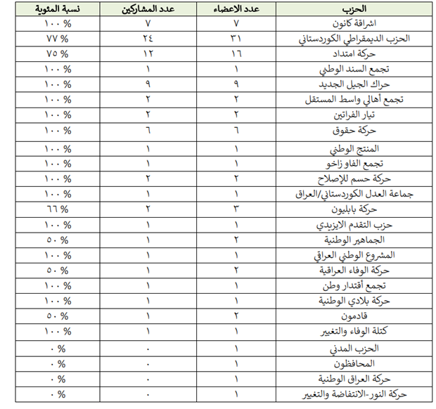خشتەی ئاستی بەشداری پەرلەمانتاران و قسەكردنیان لە دانیشتنەكان بەگوێرەی حزبە سیاسییەكانیان، لێرەدا مەبەست لەوەیە حزبە سیاسییەكە چەند پەرلەمانتاری هەبوو و چەندیان لە دانیشتنەكاندا قسەیان كردووە: