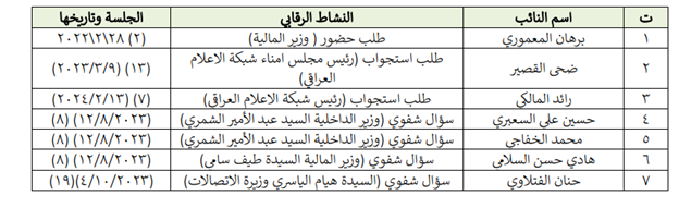 لە خولی پێنجەمدا هەموو رۆڵی چاودێریكردنی پەرلەمانی عێراق لەم خشتەیەدا كورتبووەتەوە، كە لە كۆنوسەكاندا تۆماركراوەو خۆی لە داوای لێپرسینەوەو پرسیاری زارەكی پەرلەمانتاران لە بەرپرسانی دەسەڵاتی جێبەجێكردن دەبینێتەوە: