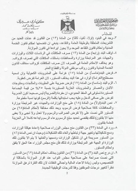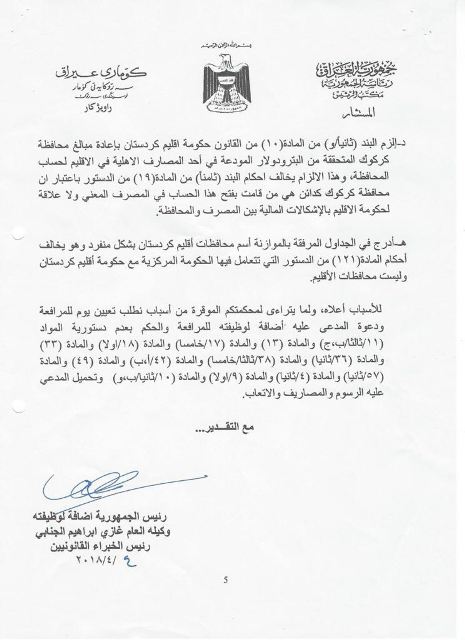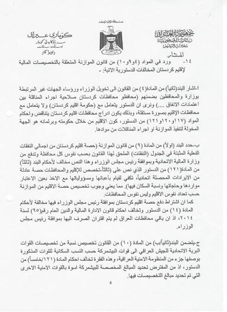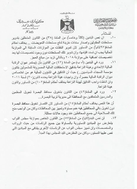 سەرۆكایەتی كۆماری عێراق جەختدەكاتەوە بەهۆی ئەوەی چەندین پێشێلكاری لە یاسای بودجەدا كراوە بۆیەوە ئەو سكاڵایەی لەسەر سەرۆكی ئەنجومەنی نوێنەران تۆماركردووە.