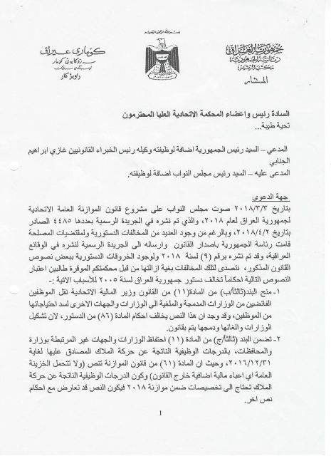 لەسەر یاسای بودجەی گشتی ساڵی 2018ی عێراقن سەرۆكایەتی كۆماری عێراق لە دادگای باڵای فیدراڵی سكاڵایەكی لەسەر سەلیم جبوری سەرۆكی ئەنجومەنی نوێنەرانی عێراق تۆماركرد.
