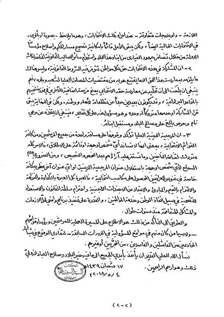 سێیەم: مەرجەعییەتی باڵا بە یەك دوری لە هەموو كاندید و لیستەكانی هەڵبژاردنەوە رادەوەسێت، بەو واتایەی پشتیوانی هیچ كەس و لایەنێك یاخود لیستێك ناكات.