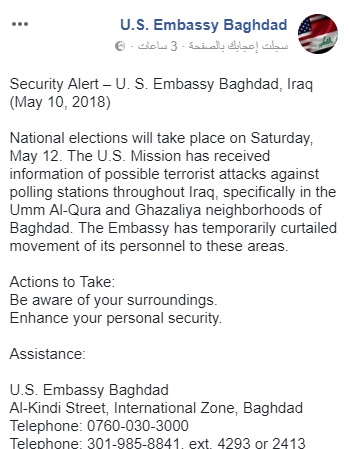 لە بەیاننامەیەكدا كە لەسەر لاپەڕەی تایبەتی خۆی لە تۆڕی كۆمەڵایەتی فەیسبوك بڵاویكردەوە، باڵیۆزخانەی ئەمریكا لە بەغداد ئاشكرایكرد" زانیاری بەدەستگەیشتووە سەبارەت بە ئەگەری رودانی هێرشی "تیرۆرستی" بۆسەر بنكەكانی دەنگدان لەسەرتاسەری عێراق، بەتایبەتیش لە ناوچەی (غەزالیە) لە بەغدادی پایتەخت.