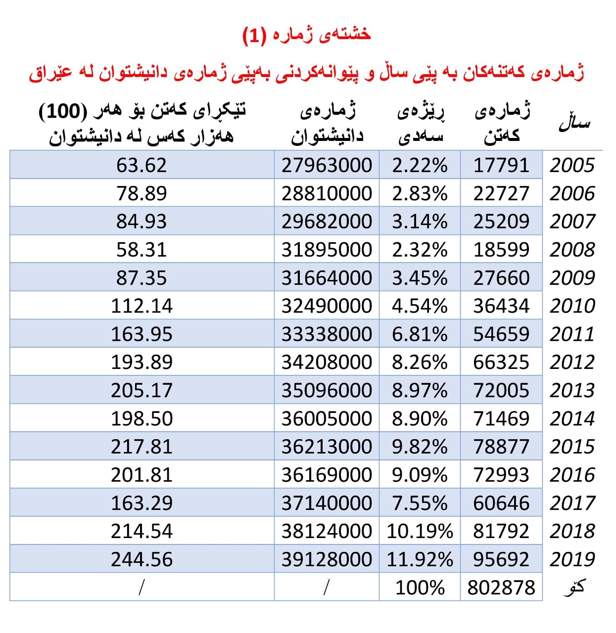 ژمارەی کەتنەکان بە پێی ساڵ و پێوانەکردنی بەپێی ژمارەی دانیشتوان لە عێراق