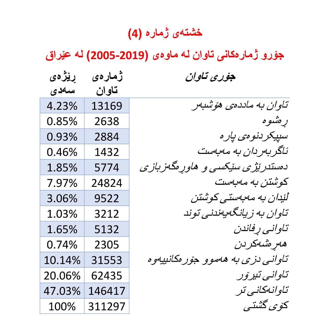 1. لە ڕووی ئەوە تاوانانەی کە لە دادگاکانی تاوان لە عێراق تۆمار کراون لە ماوەی پانزە ساڵ و لە (2005-2019) (311.297) سێ سەدو یانزە هەزار و دوو سەدو نەوەد و حەوت تاوانی گەورەو بچوکن