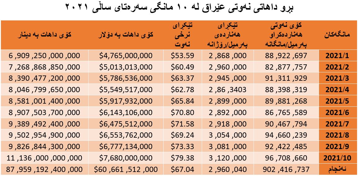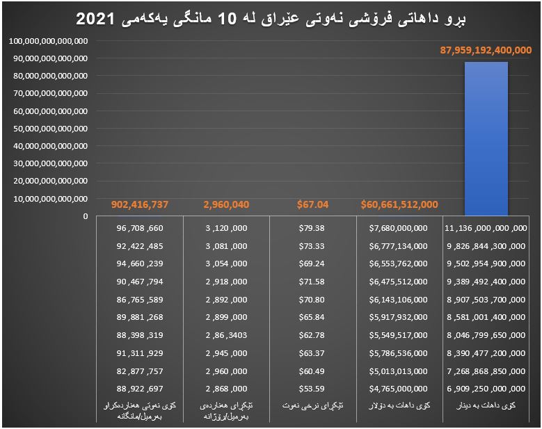 وەک دەبینین لە دە مانگی ڕابردوودا بە بەهای (٨٧) ترلیۆن و (٩٥٩) ملیار و (١٩٢) ملیۆن و (٤٠٠) هەزار دینار نەوت فرۆشراوە، واتە داهاتی نەوت بۆ هەر مانگێک بریتی بووە لە (٨) ترلیۆن و (٧٩٥) ملیار و (٩١٩) ملیۆن و (٢٤٠) هەزار دینار.