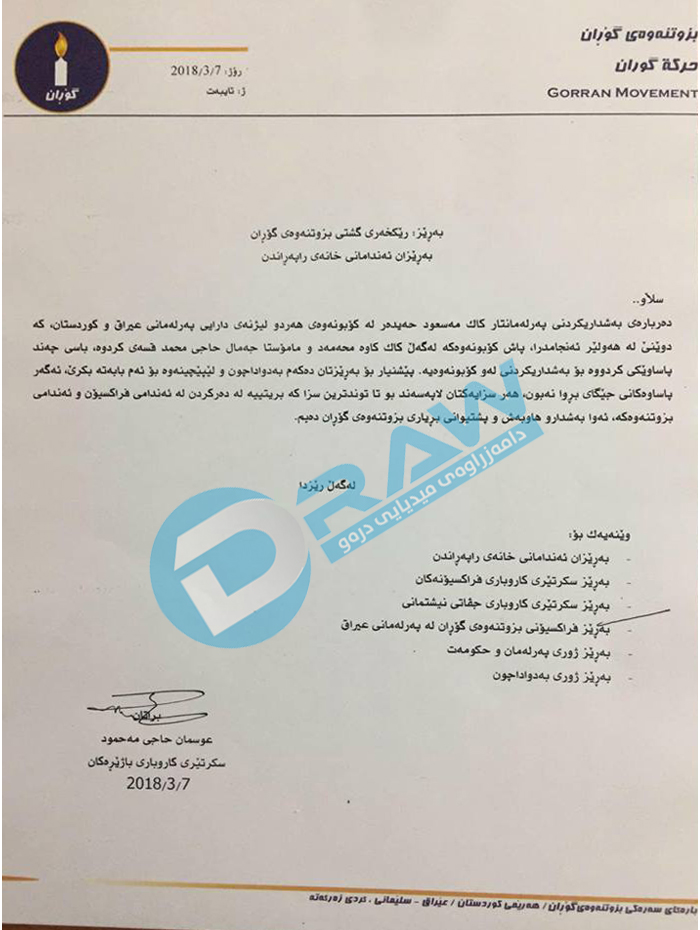 لە بەڵگەنامەی یەكەمدا كە لە رۆژی 3/7/2018 ئاراستەی رێكخەری گشتی و خانەی راپەراندنی بزوتنەوەی گۆڕانی كردووە عوسمانی حاجی مەحمود رایگەیاندووە" بەهۆی بەشداریكردنی لە كۆبوونەوەی هەردوو لیژنەی دارایی پەرلەمانی عێراق و كوردستان ، پێشنیاز بۆ بەرێزتان دەكەم، توندترین سزای پەرلەمانتار مەسعود حەیدەر بدرێت كە بریتیە لە دەركردنی لە ئەندامی فراكسیۆن و ئەندامی بزووتنەوەكە، بەشدارو پشتیوانی بڕیاری بزوتنەوەی گۆڕان دەبم"
