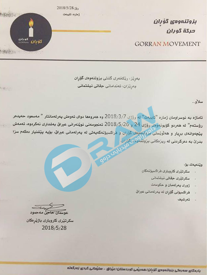 دواتر و لە بەڵگەنامەی دووەمدا كە لە رۆژی 28/5/2018 ئاراستەی رێكخەری گشتی وخانەی راپەراندنی بزوتنەوەی گۆڕانی كردووە عوسمانی حاجی مەحمود نوسیویەتی" دوای ئەوەی پەرلەمانتار ( مەسعود حەیدەر رۆستەم) لە هەردوو كۆبوونەوەی 24-26/5/2018 ی ئەنجومەنی نوێنەرانی عێراق بەشداری نەكردووە، ئەمەش پێچەوانەی بریارو هەڵوێستی بزوتنەوەی گۆڕان و فراكسیۆنەكەیەتی لە پەرلەمانی عێراق بۆیە پێشنیاز دەكەم سزا بدرێت بە دەركردن لە ریزەكانی بزووتنەوەی گۆڕان"