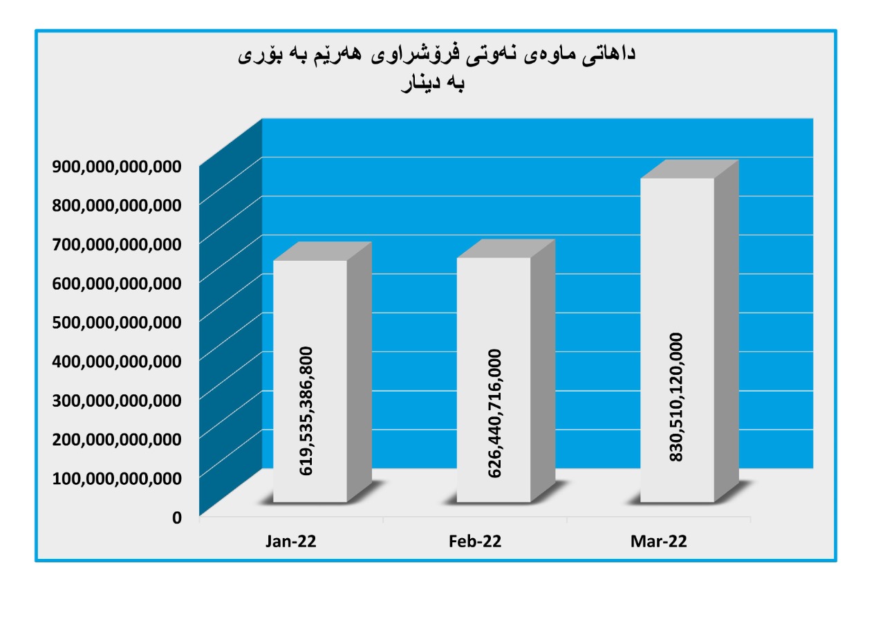 لە مانگی ئازاردا زۆرترین داهات بە دەستهاتووە لە ڕێگەی فرۆشتنی نەوتەوە، بەراورد بە مانگ و تەنانەت ساڵەکانی پێشتریش، کە بریتی بووە لە (ملیارێک و 301 ملیۆن و 740 هەزار) دۆلاری ئەمریکی.