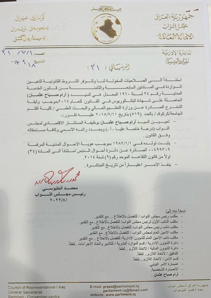نەوزاد شوانی راوێژكاری ئابوری پەرلەمانی عێراق رۆژی 18ی ئەم مانگە بە فەرمانێكی محەمەد حەلبوسی سەرۆكی پەرلەمانی عێراق لە پۆستەكەی لادراو (ئارام سەباح) برای ئومێد سەباح سەرۆكی دیوانی ئەنجومەنی وەزیرانی هەرێمی كوردستان لەسەر پشكی پارتی لە شوێنەكەی دانرا.