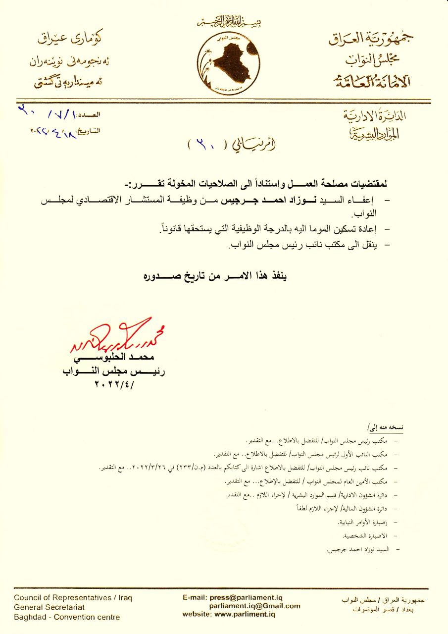 نەوزاد شوانی بەگوێرەی فەرمانەكەی محەمەد حەلبوسی سەرۆكی پەرلەمان، لەدوای لابردنی لە پۆستی راوێژكاری ئابوری پەرلەمان، گواستراوەتەوە بۆ نوسینگەی شاخەوان عەبدوڵا جێگری سەرۆكی پەرلەمان لەسەر پشكی پارتی.