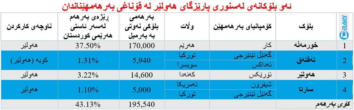 7. چۆمان: لە قەزای چۆمان، سەرەتا پشکەکان درا بە کۆمپانیای (تورکش ئینتیتی)ی بە پشکی (80%) و (20%)ی پشكی (كیپكۆ) بەڵام دواتر کۆمپانیاکە لەو بلۆکە کشایەوە.