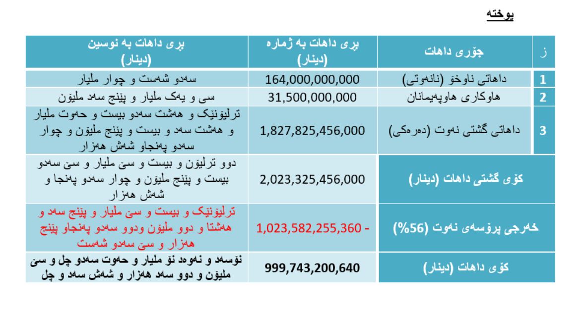 • (804 ملیار و 243 ملیۆن و 200 هەزار و 640) داهاتی نەوت + (164 ملیار) داهاتی ناوخۆ + (31 ملیار 500 میلۆن) هاوپەیمانان = (999 ملیار و 743 ملیۆن و 200 هەزار و 640) دینار