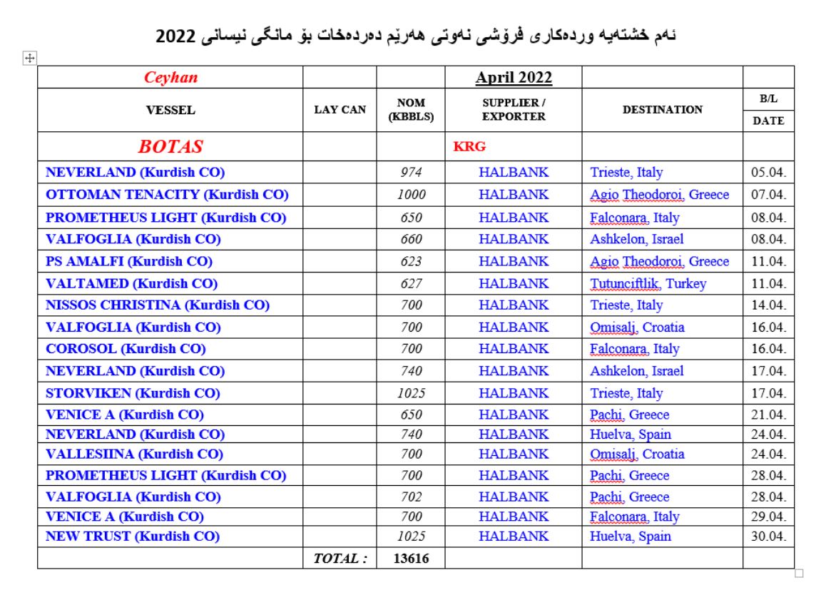 • هەرێمی کوردستان لە مانگی نیسانی (2022)دا بڕی (13 ملیۆن و 616 هەزار) بەرمیل نەوتی هەناردەکردوە لە ڕێگای بەندەری جیهانی تورکیاوە.