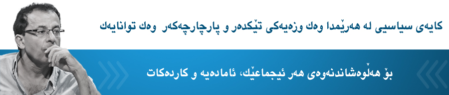 ناوەندی سیاسیی لە ھەرێمدا ھەم خۆی ناوەندێکی داوەشاو و دابەشە بەسەر چەندان خێزان و بنەماڵەی سیاسیی ناکۆک و جیاوازدا، لەناو یەک بنەماڵەشدا دابەشە بەسەر چەندان کەسایەتی و بەرەی ناتەبا و ناجۆردا. ھەم وزەیەکی گەورەی بەشبەشکردن و پارچەپارچەکردنی کۆمەڵاگەشە. ئەم کایە سیاسیە ڕێی لە دروستبوونی ھەر ھاوبەشێک گرتوە کە بکرێت ئیجماعێک لە ئیجماعەکانی لەسەر دروستببێت. ئەوەشی ھێزێکی گەورەی بەم ناوەندە سیاسییە بەخشیوە و کردویەتی بە کابوسێکی زەبەلاح، قۆرخکردنی ئابوریی و قۆرخکردنی دەزگاکانی دەوڵەت و قۆرخکردنی حوکمڕانیکردنە، لە ھەرێمدا.