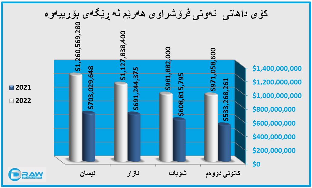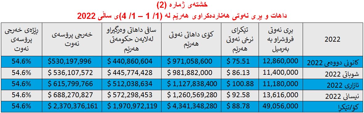 بەڵام لە چوار مانگی یەکەمی (2022) بڕەی داهاتەکە بەڕێژەی (42%)بەرزبۆتەوە، بەجۆرێک کۆی بەهای نەوتی فرۆشراو گەیشتووە بە (4 ملیار و 341 ملیۆن و 348 هەزار 280) دۆلار.