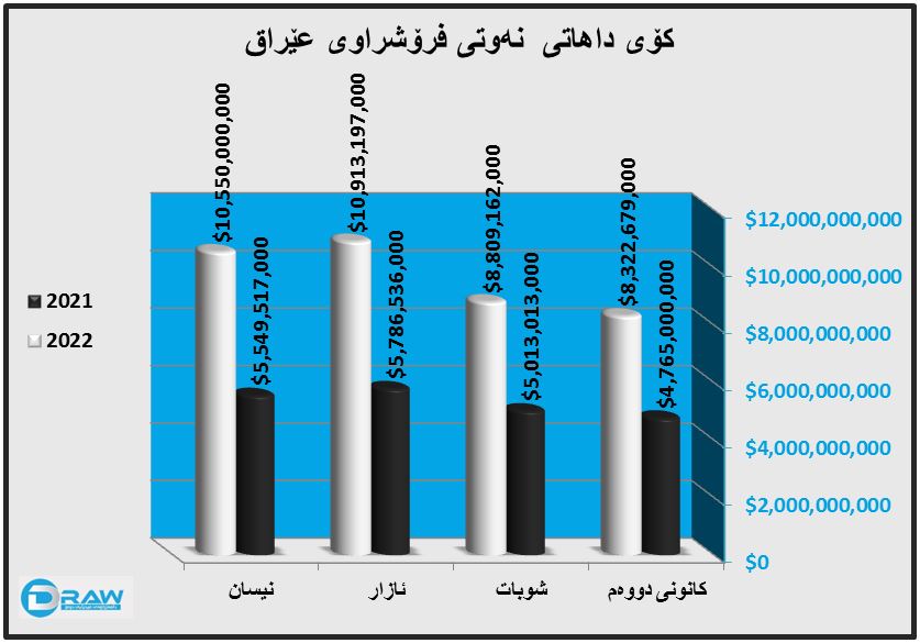 بەڵام لە چوار مانگی یەکەمی (2022) بڕەی داهاتەکە بەڕێژەی (45.3%)بەرزبۆتەوە، بەجۆرێک کۆی بەهای نەوتی فرۆشراو گەیشتووە بە (38 ملیار و 595 ملیۆن و 38 هەزار) دۆلار.