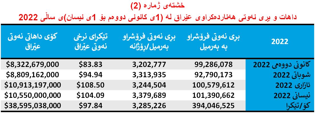 بەڵام لە چوار مانگی یەکەمی (2022) بە تێکڕا بەرمیلێک نەوتی عێراق بە (97.84) دۆلار فرۆشراوە.