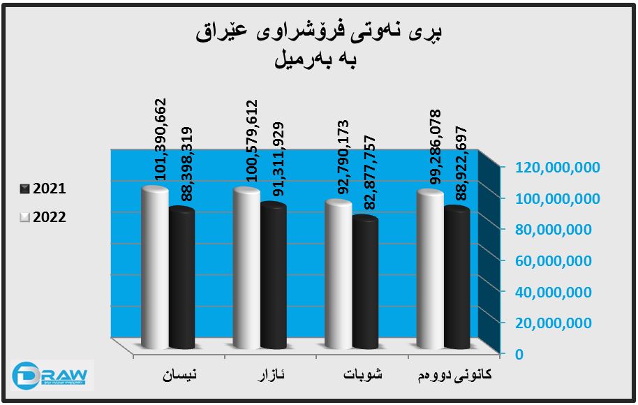 بەڵام لە چوار مانگی یەکەمی (2022) بڕەکە بەرزبووتەوە بۆ (394 ملیۆن و 46 هەزار و 525) بەرمیل نەوتی فرۆشراو.