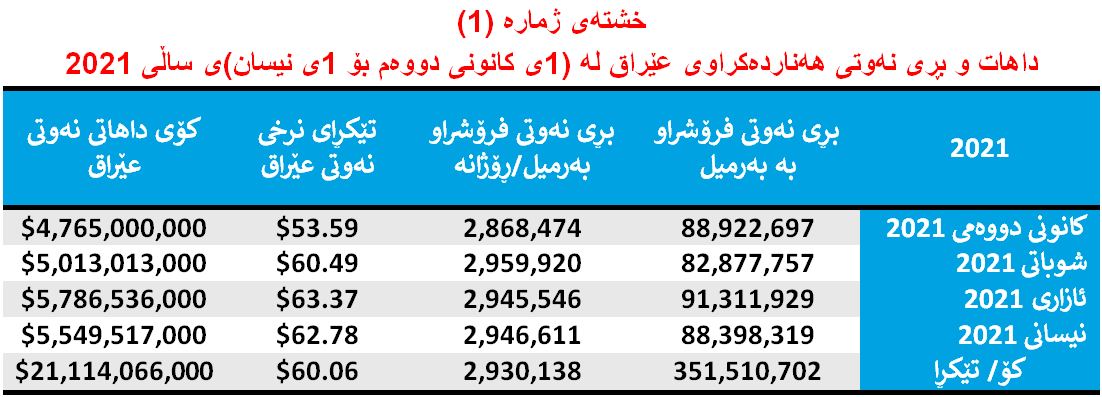وەک لە هەردوو خشتەی ژمارە (1 و 2) دا هاتبوو، حکومەتی عێراق لە چوار مانگی یەکەمی ساڵی (2021) بە بەهای (21 ملیار و 114 ملیۆن و 66 هەزار) دۆلار نەوتی فرۆشتووە.