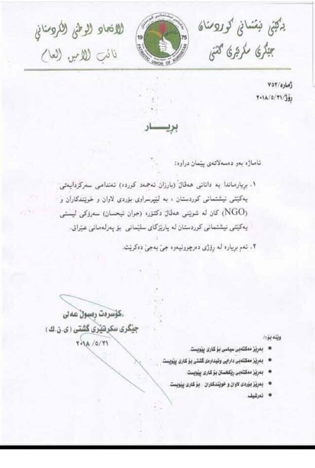 بەپێی نوسراوێك كە ئیمزای كۆسرەت رەسوڵ عەلی جێگری سكرتێری گشتی یەكێتی بەسەرەوەیە بریادراوە بە دانانی بەرزان ئەحمەد كوردە بە لێپرسراوی بۆردی لاوان و خوێندكاران و ( NGO ) كان لە شوێنی ( جوان ئیحسان) سەرۆكی لیستی یەكێتی نیشتمانی كوردستان لە پارێزگای سلێمانی بۆ پەرلەمانی عێراق، نوسراوەكە ئەوەشی خستوەتەروو كە بڕیارەكە لە رۆژی دەرچونیەوە كاری پێدەكرێت كە لە 21/5/2018 دەرچووە.