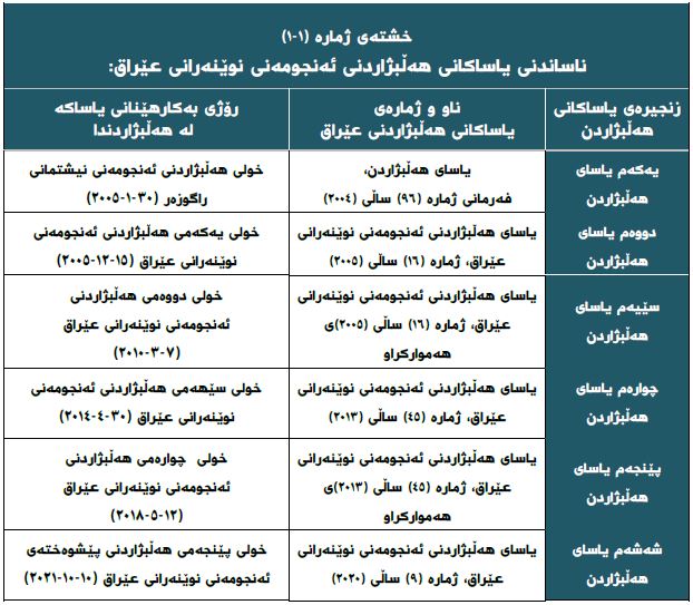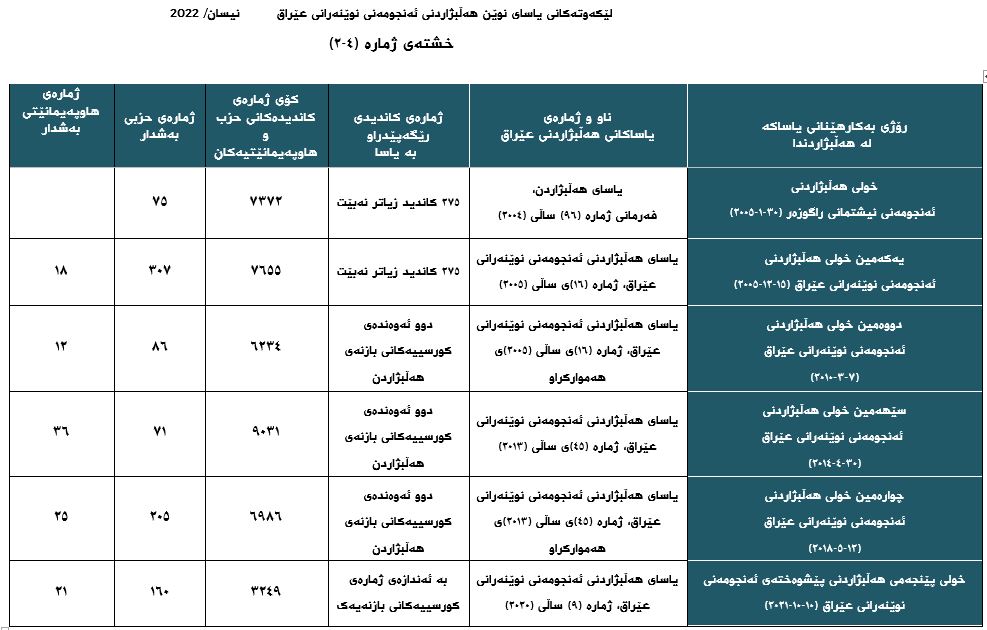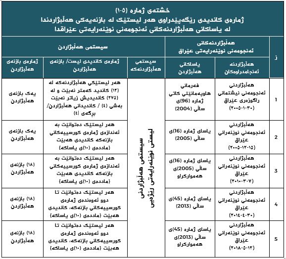 • یاساکانی هەڵبژاردنی ئەنجومەنی نوێنەرانی عێراق سەقامگیریی تەشریعیان تێدا نییە و بە ئەندازەی ژمارەی هەڵبژاردنە ئەنجامدراوەکان یاسای هەڵبژاردنیش هەموارکراوەتەوە و دەرچووە.