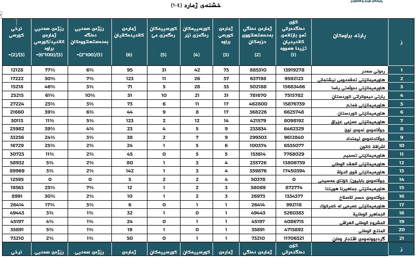 رێژەی دەنگی گۆڕدراو و نەگۆڕدراوی حزبەکان بۆ کورسی