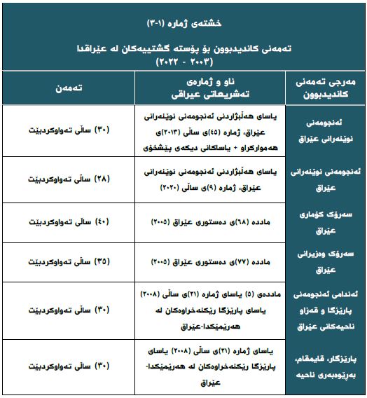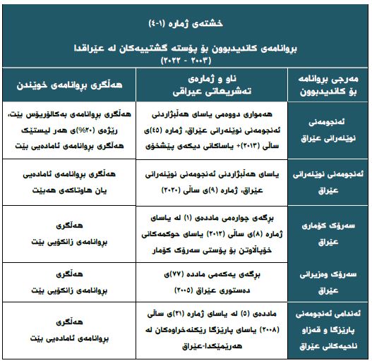 • هەموو یاساکانی هەڵبژاردنی ئەنجومەنی نوێنەرانی عێراق (جگە لە یاسای ژمارە (٩)ی ساڵی ٢٠٢٠) دەرفەتێکی بچوکیان لەبەردەم ئەو کەسانەدا رەخساندووە کە دەیانەوێت وەک کاندیدی تاکەکەسی بەشداری لە هەڵبژاردنەکاندا بکەن و تەنانەت بە قەوارەی سیاسی و لیستی تاکەکەسی ناوبراون.