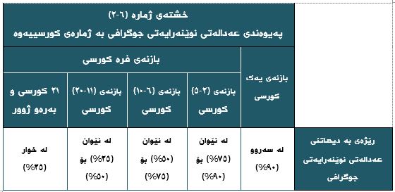 لە خشتەی ژمارە (٦-٢)ی خوارەوەدا، هەوڵدراوە بە شێوەیەکی نزیکەیی پەیوەندی نێوان ئاستی بەدیهاتنی رێژەی عەدالەتی نوێنەرایەتی جوگرافی بە ژمارەی کورسی/یەکانی بازنەی هەڵبژاردنەوە بخرێتەڕوو، دیارە ئەو بەدیهاتنەش بەپێی ژمارەی دانیشتوانی بازنەی هەڵبژاردنەکەو ژمارەی ئەو یەکە کارگێریانەی دەکەونە نێو هەر بازنەیەکی هەڵبژاردنەکەوە، گؤڕانی رێژەییان بەسەردا دێت.