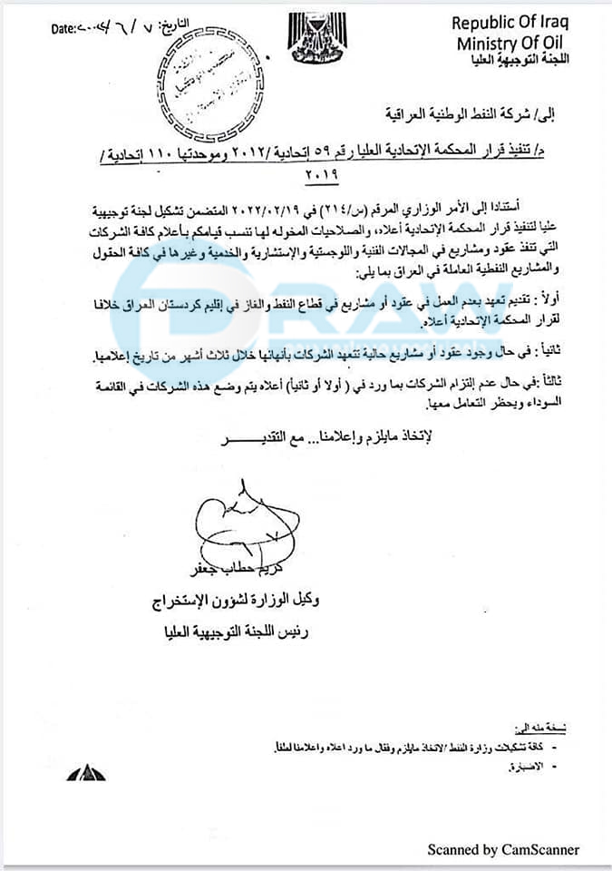 وەزارەتی نەوتی عێراق لیژنەیەكی باڵای درووستكردووە بۆ جێبەجێكردنی بڕیارەكەی دادگای فیدراڵی سەبارەت بە نەوتی هەرێم و داوا لە كۆمپانیا نەوتیەكان دەكات لە هەرێم كارنەكەن: