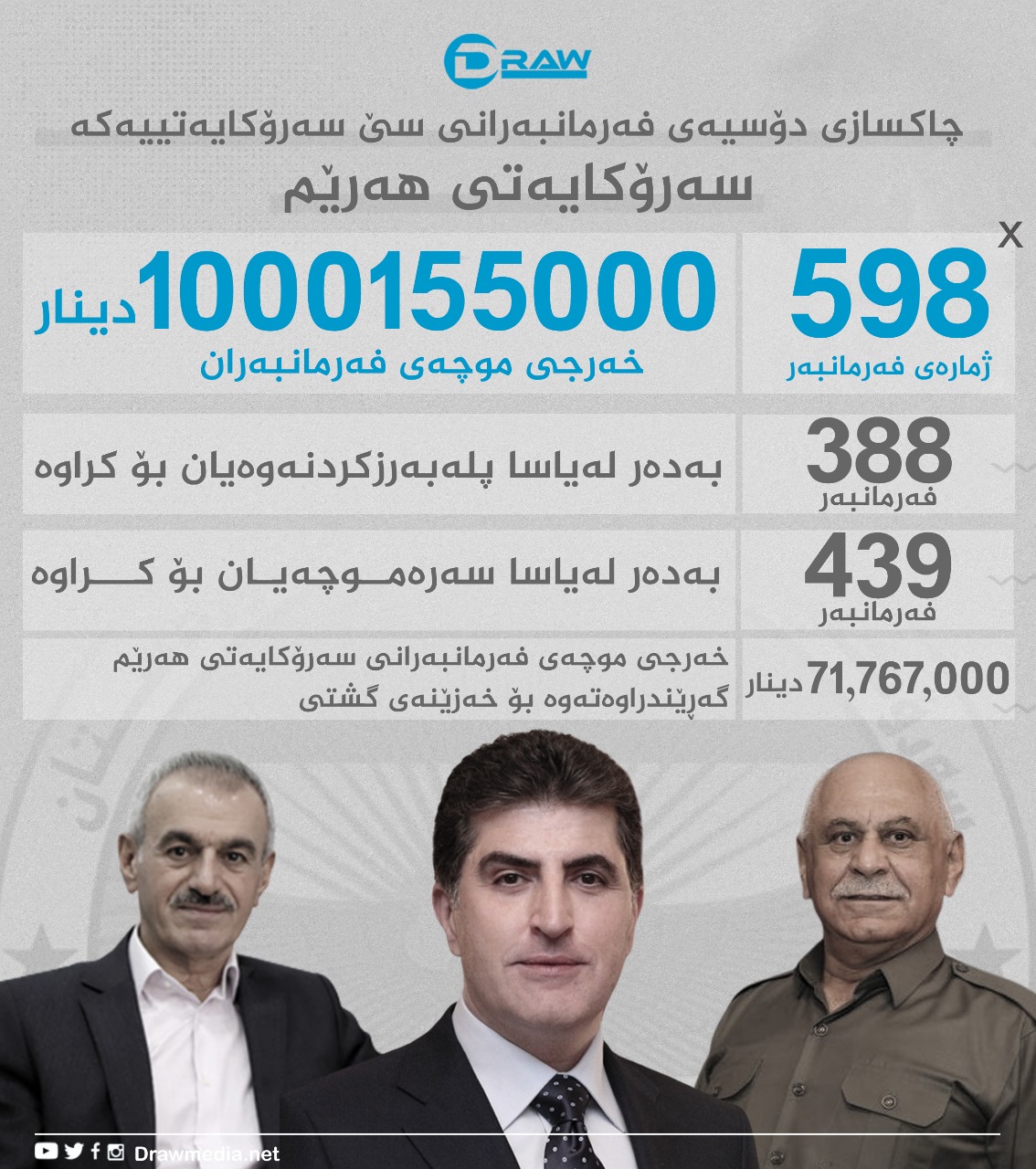 تەنیا خەرجی موچە لە سەرۆكایەتی هەرێمی كوردستان مانگانە بڕەكەی (ملیارێكو 155 هەزار) دینارە.