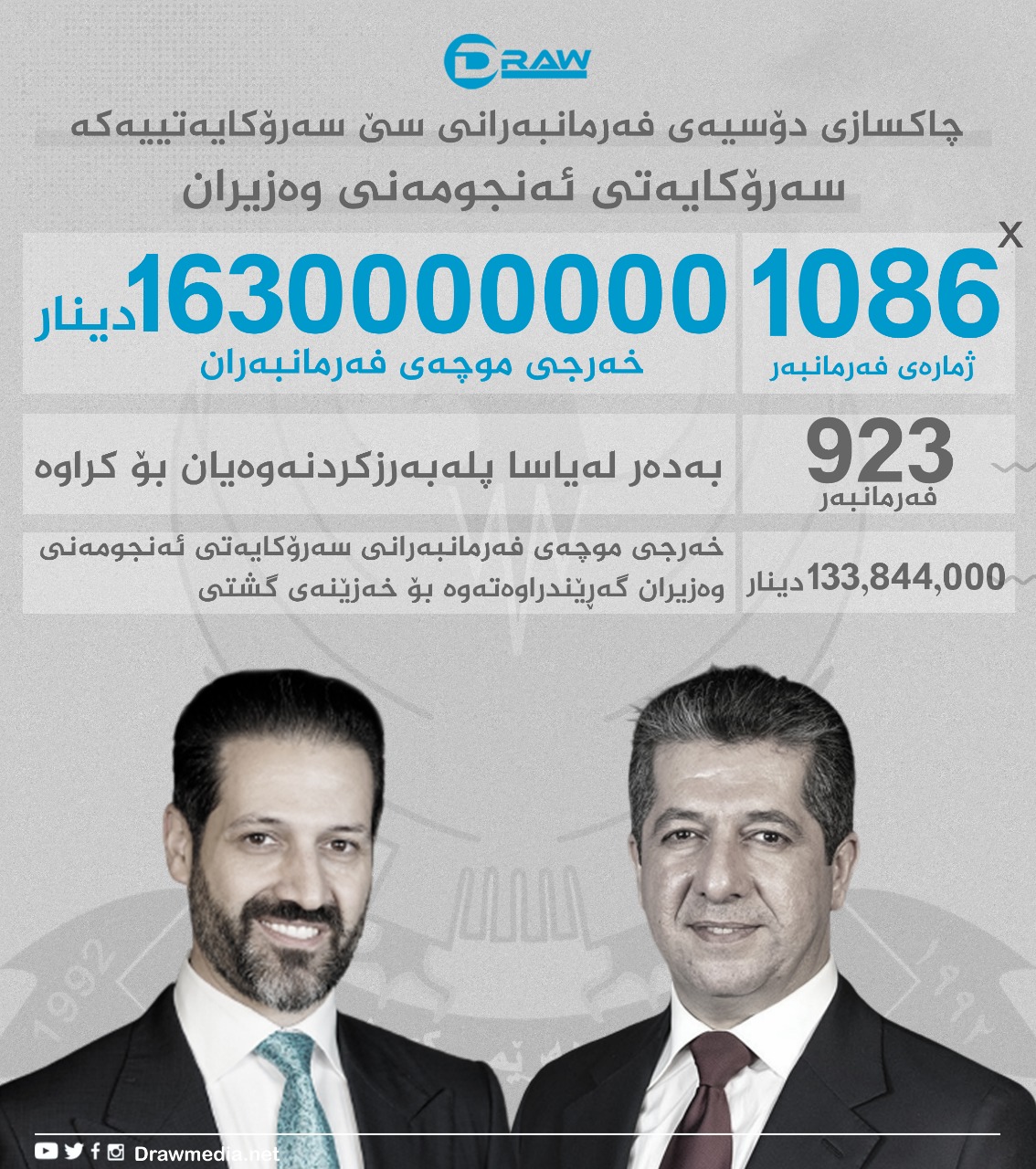 تەنیا خەرجی موچە لە ئەنجومەنی وەزیرانی هەرێمی كوردستان مانگانە بڕەكەی (ملیارێكو 630 ملیۆن) دینارە.
