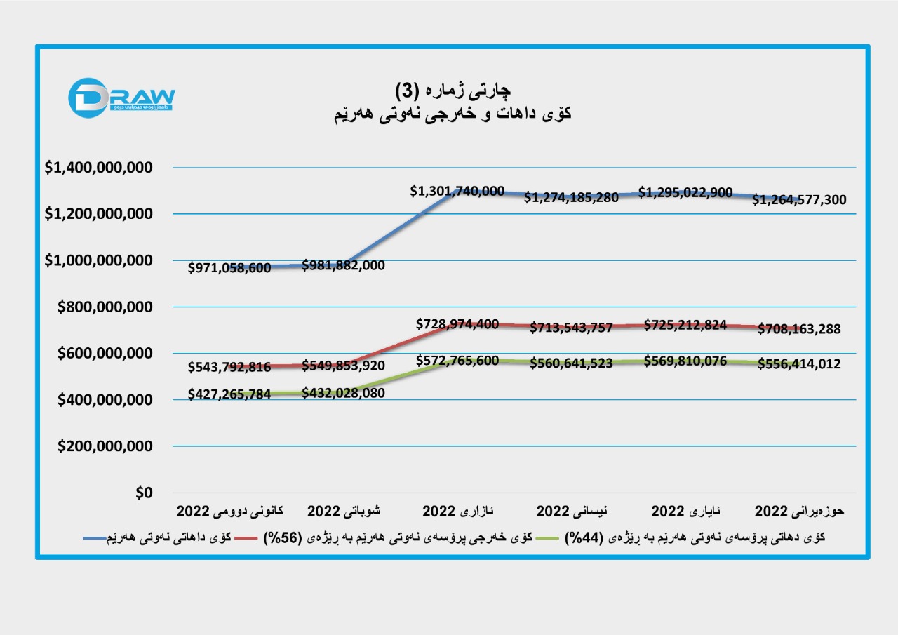 بەپێی دواین ڕاپۆرتەکانی ڕێکخراوی دیلۆیت بۆ وردبینی پرۆسەی نەوتی هەرێمی کوردستان لە ساڵی (2021)دا، (56%)ی داهاتی نەوت بۆ خەرجی پرۆسەکە دەڕوات، بۆیە کۆی ئەو داهاتەی لە ماوەی نیوەی یەکەمی ساڵی (2022) لە پرۆسەی نەوتدا بە خەرج دراوە، بریتی بووە لە (3 ملیار و 969 ملیۆن و 541 هەزار و 5) دۆلاری ئەمریکی (بڕوانە خشتەی ژمارە (1) و چارتی ژمارە (3))، بە جۆرێک؛