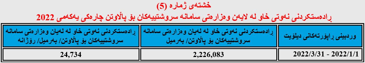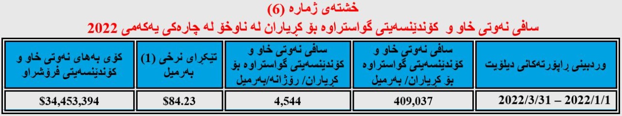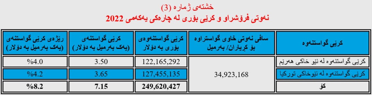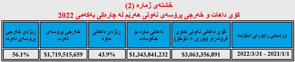 تێبینی/ ئەگەر تێکڕای نرخی نەوتی فرۆشراوی سێ مانگی یەکەمی (2022) وەربگرین، وەک لە ڕاپۆرتەکەی دیلۆیت ئاماژەی پێدراوە ئەوا نرخی هەر بەرمیلێک بریتی دەبێت لە (87.2) دۆلار نەک (86.73) دۆلار، کۆی داهاتەکەشی (3 ملیار و 45 ملیۆن و 311 هەزار و 891) دۆلار دەبێت نەک (3 ملیار و 28 ملیۆن و 903 هەزار و 497) دۆلار، بەڵام لە خشتەکەدا هەمان ئەو ئەنجامەمان داناوە کە دیلۆیت ئاماژەی پێداوە، چونکە وەک ڕاپۆرتەکەی دیلۆیت ئاماژەی پێداوە بەشێک لە نەوتەکە لە کارگۆی نەوتی بێ مواسەفات و ئاو بە هەرزانتر فرۆشراوە.
