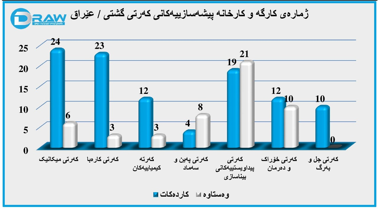 بە پێی داتاکان (لە هەردوو کەرتی تایبەت و گشتی) نزیکەی (18 هەزار) پرۆژەی پیشەسازی لە عێراق بە هۆکاری جۆراو جۆر لە کارکردن وەستاون و هیچ بەرهەمێکیان نیە، لە کاتێکدا پێش ساڵی (2003) کەرتی پیشەسازی لە عێراق (23%) کۆی گشتی قەبارەی بەرهەمی ناوخۆیی پێکهێناوە .