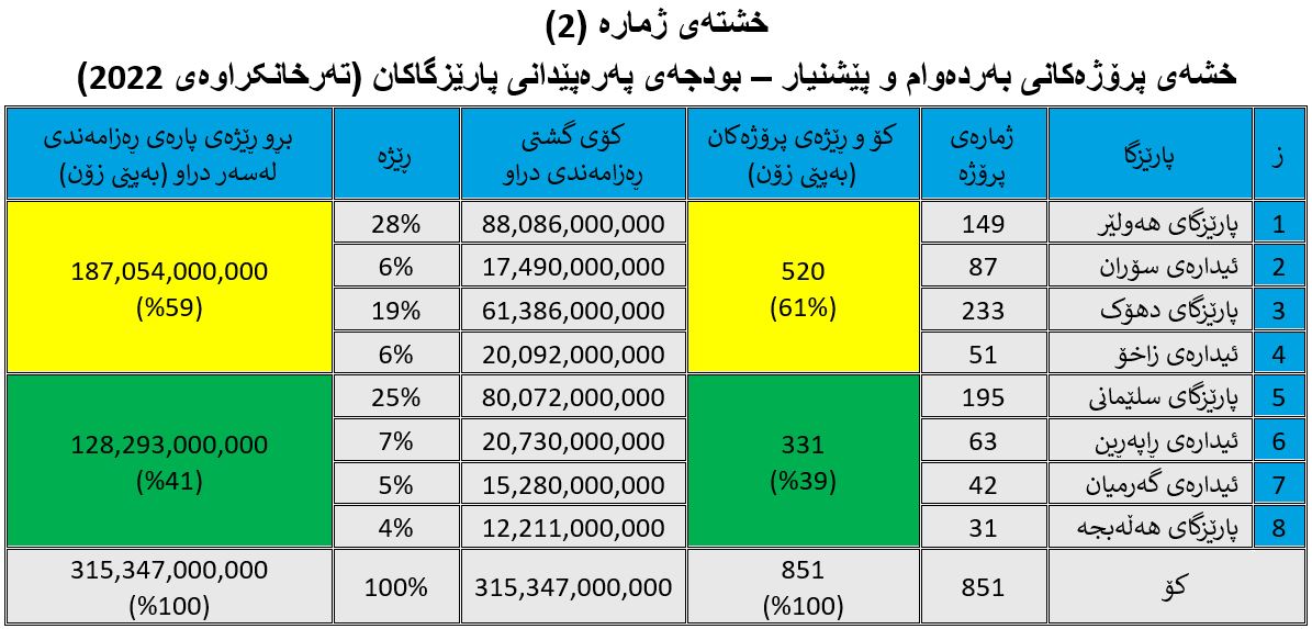 بڕی (187 ملیار و 54 ملیۆن) دینار بە ڕێژەی (59%) بۆ (520) پرۆژەی پارێزگاکانی هەولێر و دهۆک و ئیدارەکانی سۆران و زاخۆ (زۆنی زەرد) تەرخان کراوەو دەکرێت. بڕی (128 ملیار و 293 ملیۆن) بە ڕێژەی (41%) بۆ (331) پرۆژەی سنوری پارێزگاکانی سلێمانی و هەڵەبجە و ئیدارەکانی گەرمیان و ڕاپەڕین (زۆنی سەوز) تەرخان کراوەو دەکرێت. (بڕوانە خشتەو چارتی ژمارە (2))