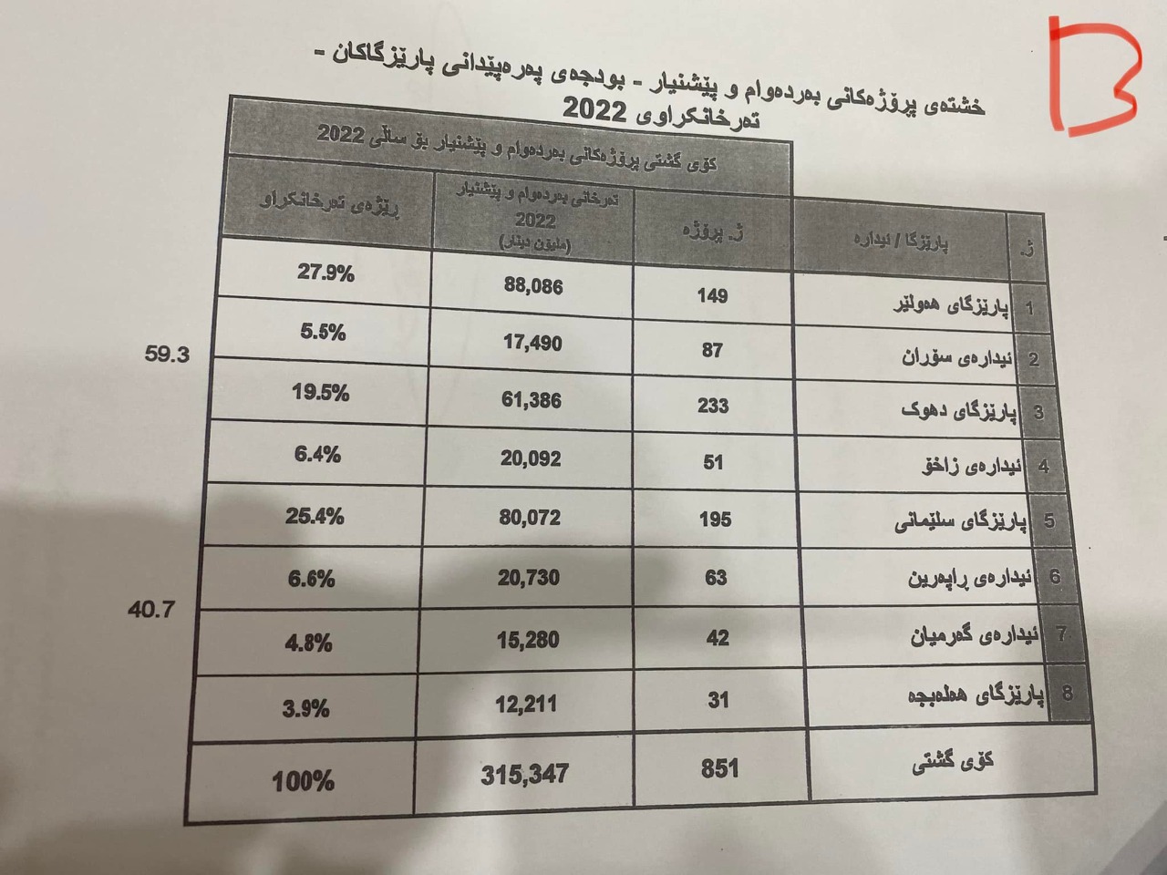بەپێی بەڵگەنامەیەک کە پەرلەمانتار (بەڵێن ئیسماعیل) بڵاوی کردووەتەوە، حکومەتی هەرێمی کوردستان لە ساڵی (2021)دا بەپێی نوراوی ژمارە (2560 لە 25/2/2021) ڕەزامەندی خەرجکردنی بڕی (349 ملیار و 720 ملیۆن) دیناری بۆ پرۆژەکانی پارێزگاکانی هەرێمی کوردستان دەربڕیوە.