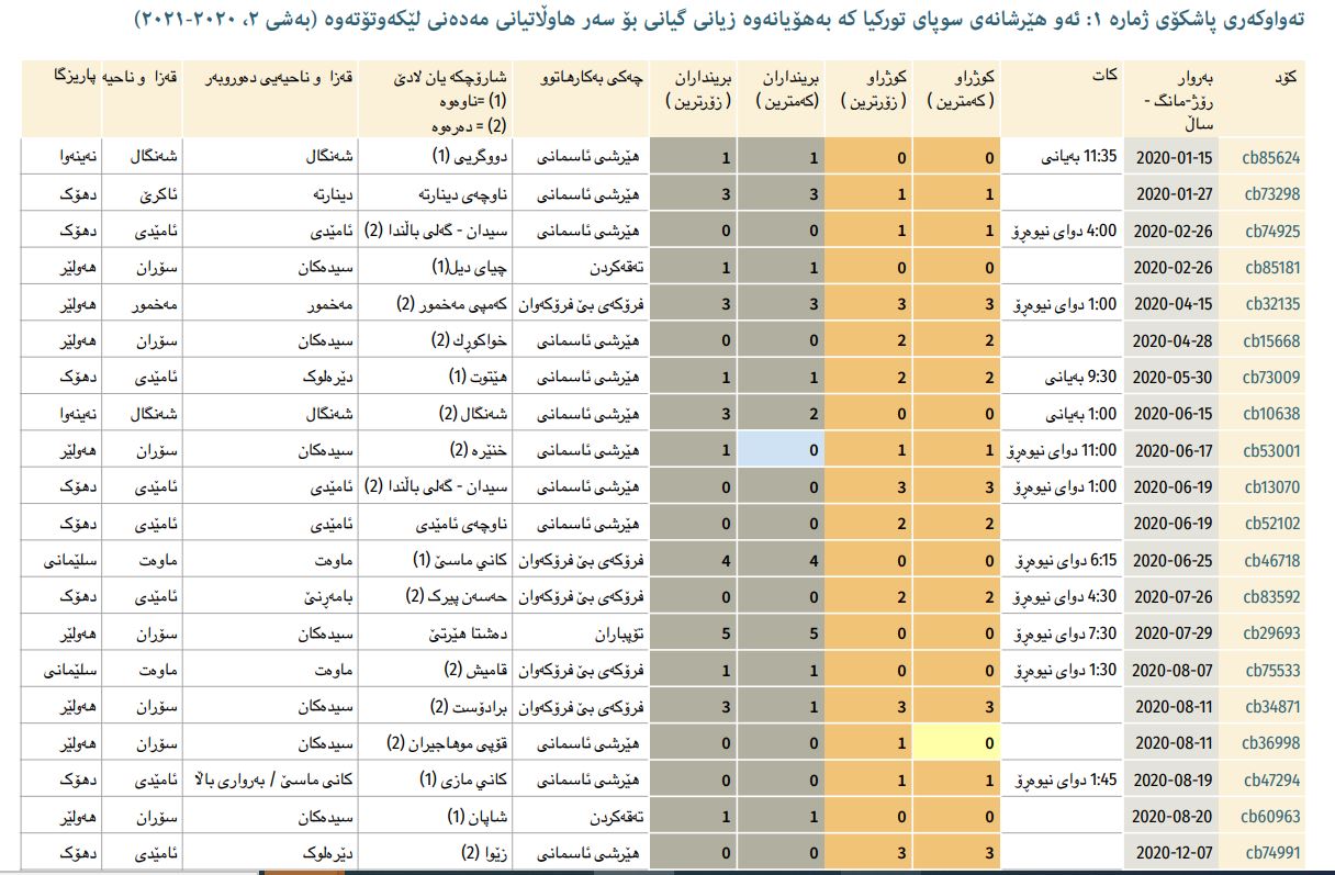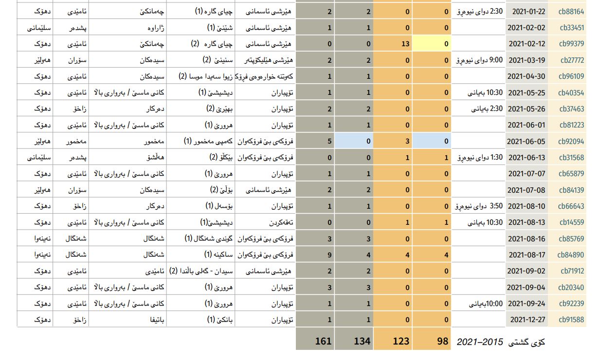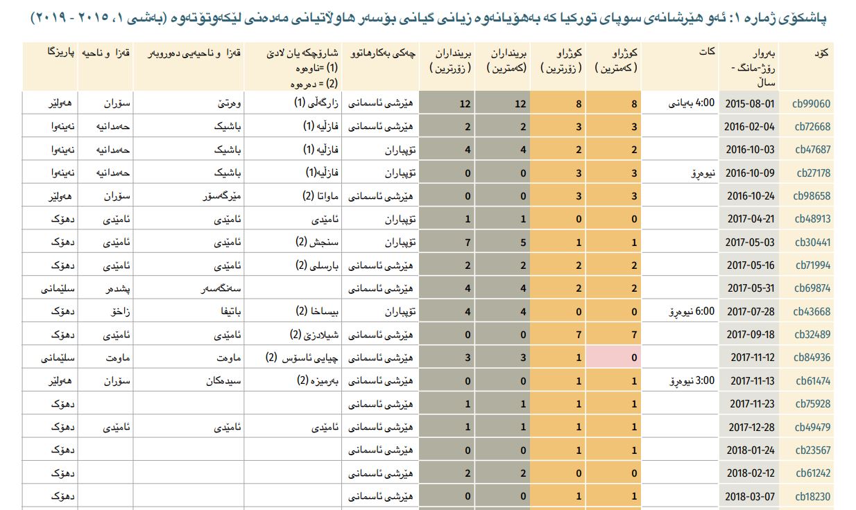 • لە ئابی ٢٠١٥ەوە تاوەكو كانوونی یەكەمی ٢٠٢١، سوپای توركیا زیاتر لە ٤ ھەزار ھێرشی ئاسمانی و تۆپھاوێژی و زەمینی لە ھەرێمی كوردستان و باكوری عێراقدا ئەنجامداوە.