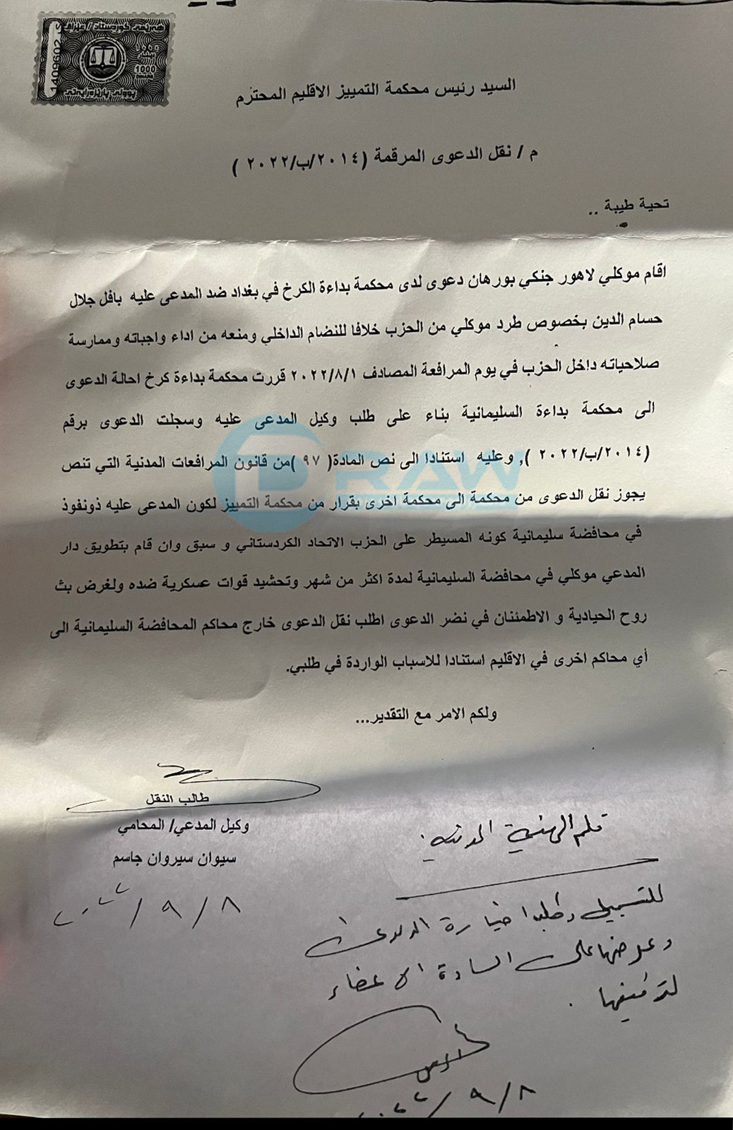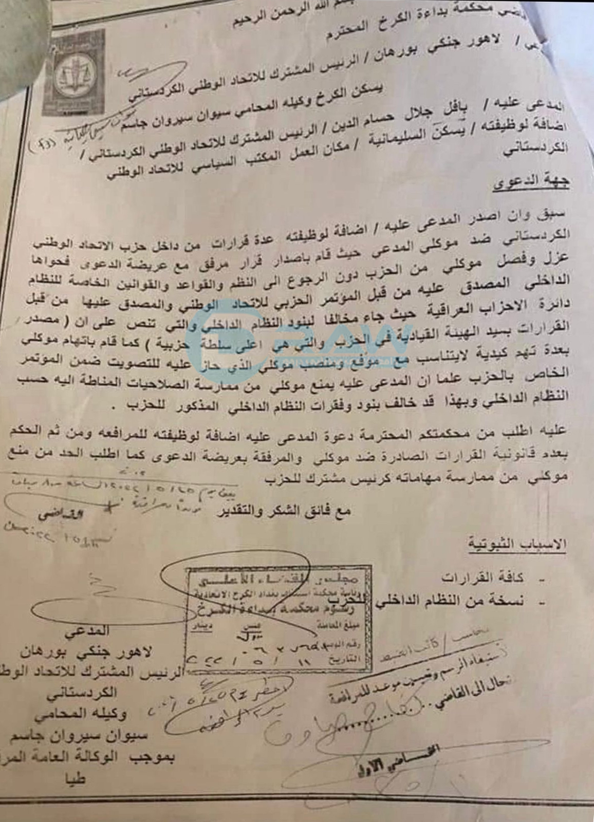 بریكارەكەم (لاهور شێخ جەنگی) لە دادگای كەرخی بەغداد سكاڵای لەسەر بافڵ تاڵەبانی تۆماركردووە لەبەر ئەوەی لە حزب دووریخستووەتەوە، ئەمەش كارێكە پێچەوانەی پەیڕەوی ناوخۆی یەكێتیە.