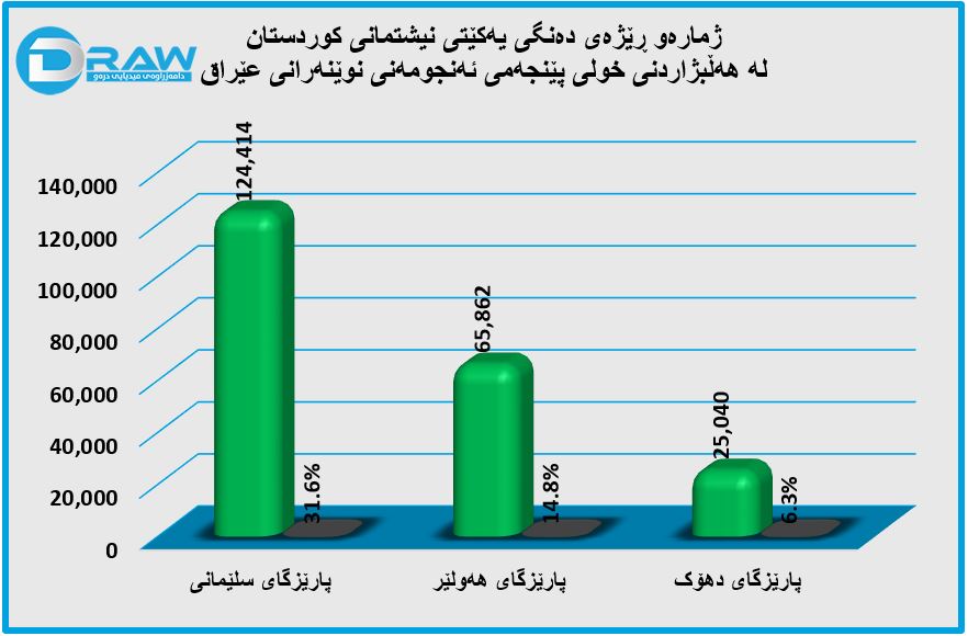 - دەنگی یەکێتی لە پارێزگای سلێمانی (124 هەزارو 414) دەنگ بەرێژەی (31.6%)