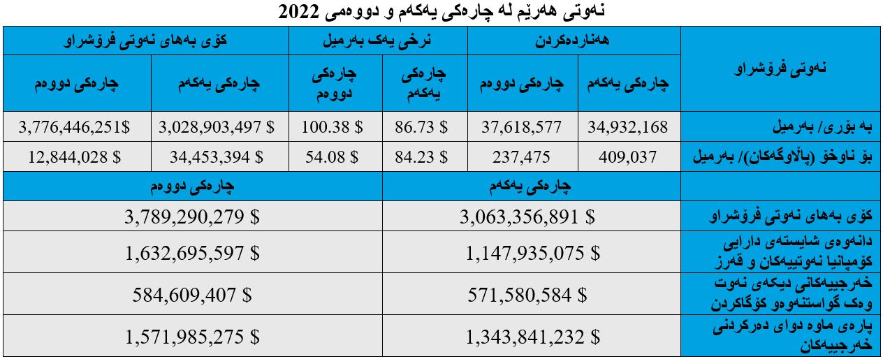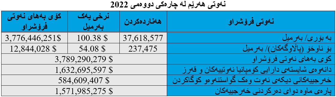 لە چارەکی یەکەمدا بڕی (1 ملیار و 343 ملیۆن و 841 هەزار و 232) دۆلار بە ڕێژەی (44%)ی داهاتی گشتی نەوت گەڕاوەتەوە بۆ حکومەتی هەرێمی کوردستان، بەڵام لە چارەکی دووەمی (2022)دا بڕی (1 ملیار و 571 ملیۆن و 985 هەزار و 275) دۆلاری بە ڕێژەی (41.5%) گەڕاوەتەوە بۆ حکومەت و بەم پێیەش، بڕی (228 ملیۆن و 144 هەزار و 43) دۆلار داهاتی نەوت زیادی کردووە.